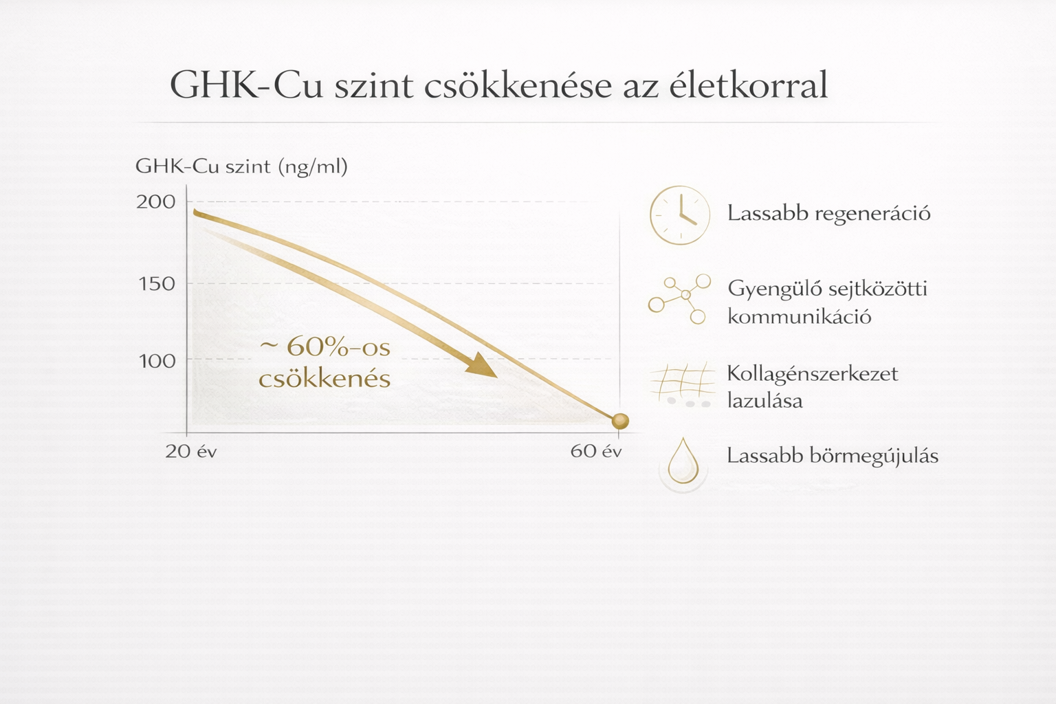 A GHK-Cu természetes módon jelen van a szervezetben, azonban szintje az életkor előrehaladtával fokozatosan csökken. Klinikai adatok szerint ez az érték körülbelül 200 ng/ml-ről 80 ng/ml-re esik 20 és 60 éves kor között, ami jelentős visszaesést jelent.