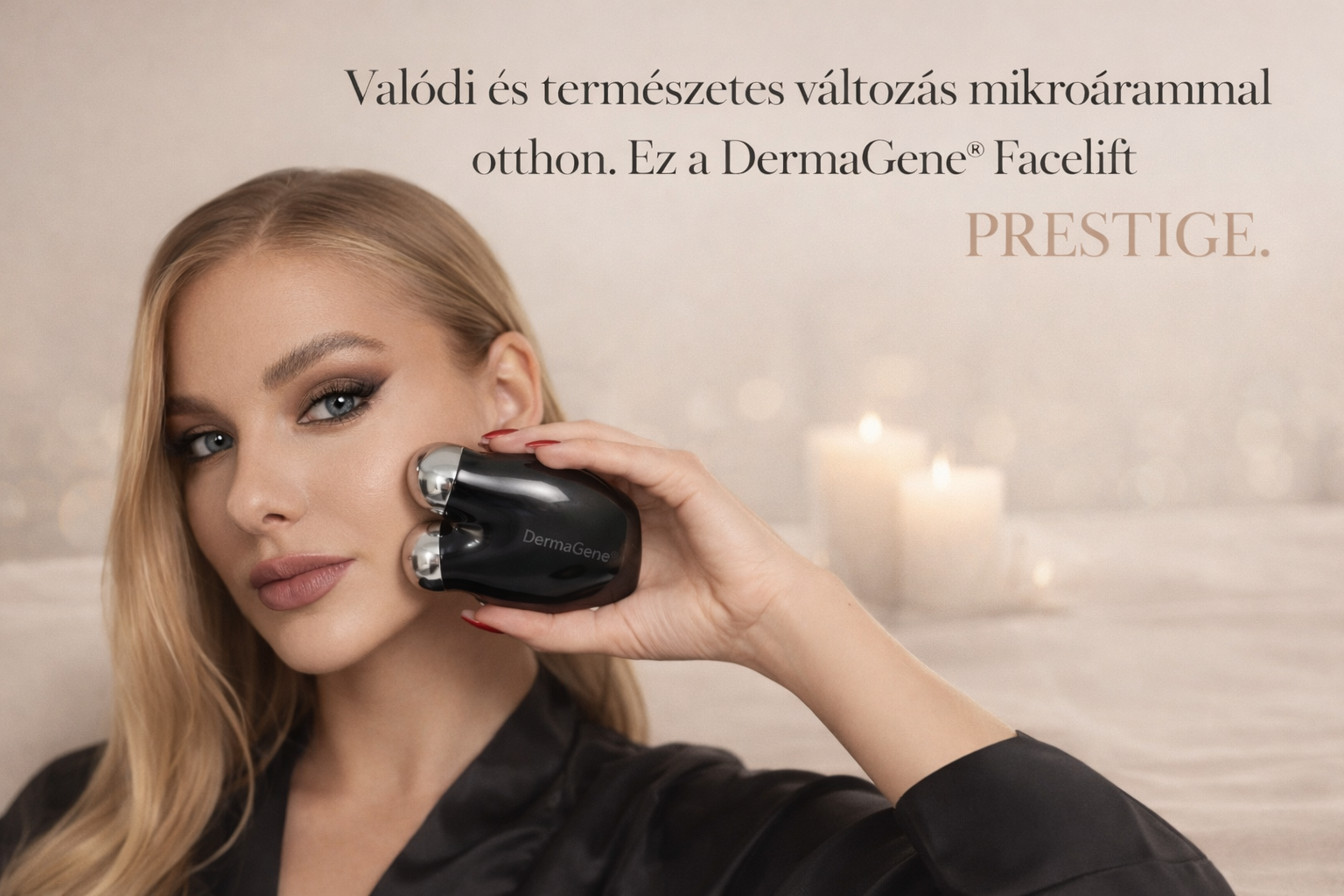 A DermaGene® Facelift PRESTIGE egy luxuskategóriás, extra erős, ELLE Beauty Awards – Innováció kategória győztes mikroáramos arcfeszesítő készülék. Otthoni használatra tervezve, szalontechnológiával –a természetes, fokozatos és látható megújulásért. Csak 15 perc a megemelt, tömör és feszes arcbőrért.