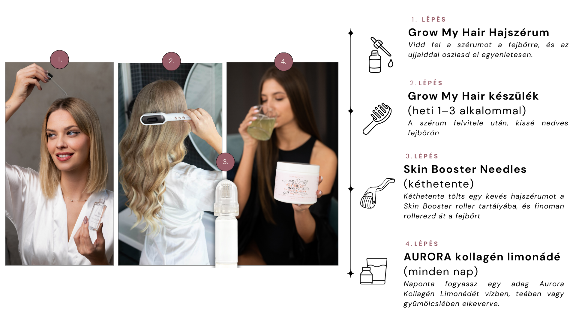 A gondosan összeválogatott eszközök és szérumok támogatják a fejbőr állapotát, erősítik a hajszálakat és elősegítik a hajhagymák aktivitását, míg a kollagénital belülről járul hozzá a haj szerkezetének támogatásához. Rendszeres használat mellett a haj 8 hét alatt fokozatosan erősödik, sűrűbbé válhat, és visszanyeri természetes fényét, egészséges megjelenését.